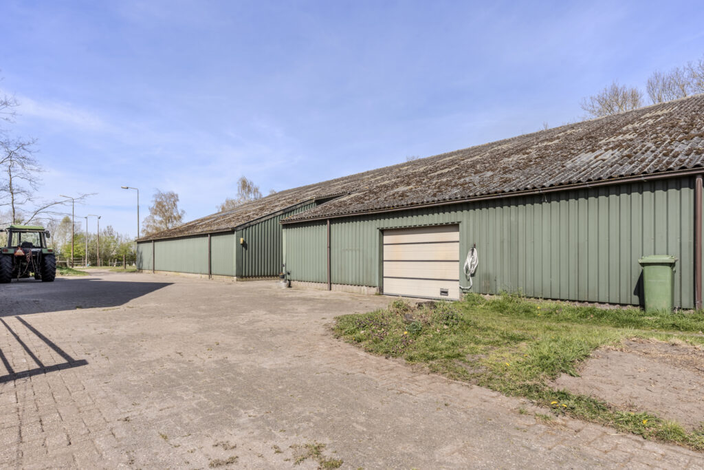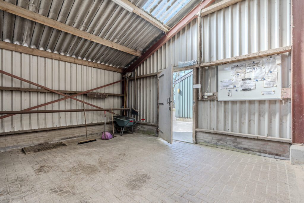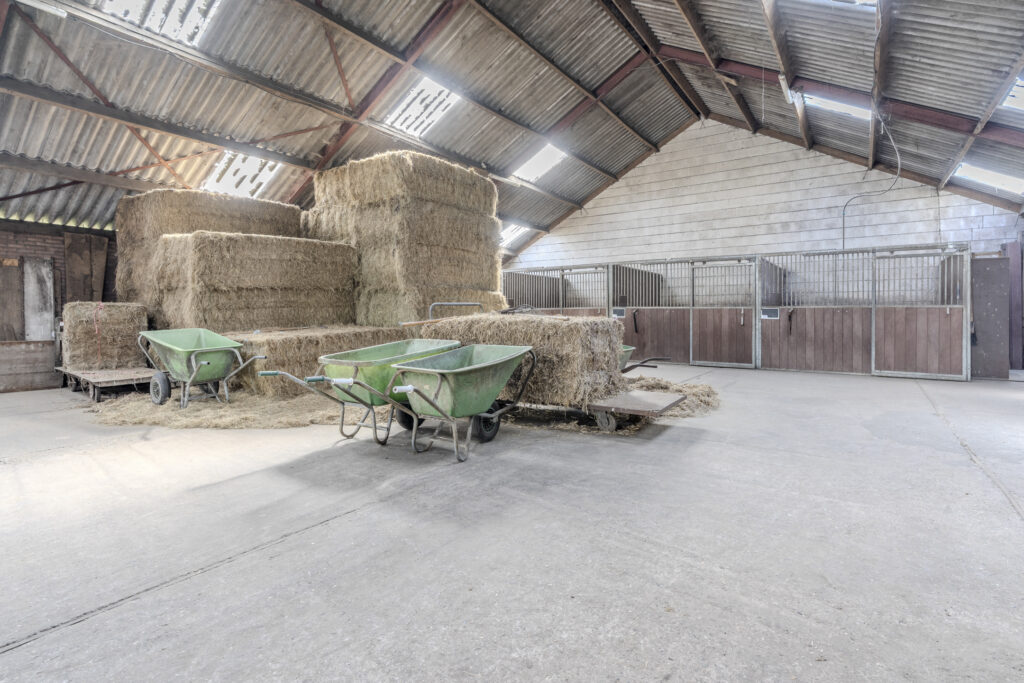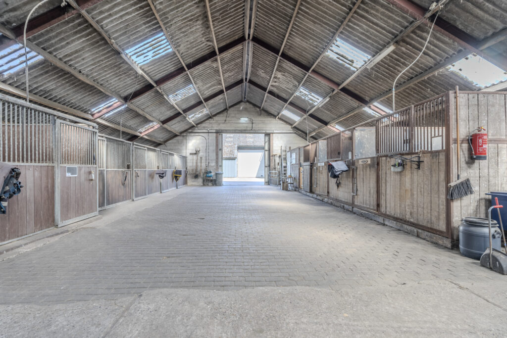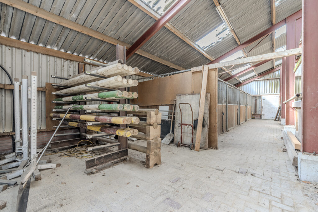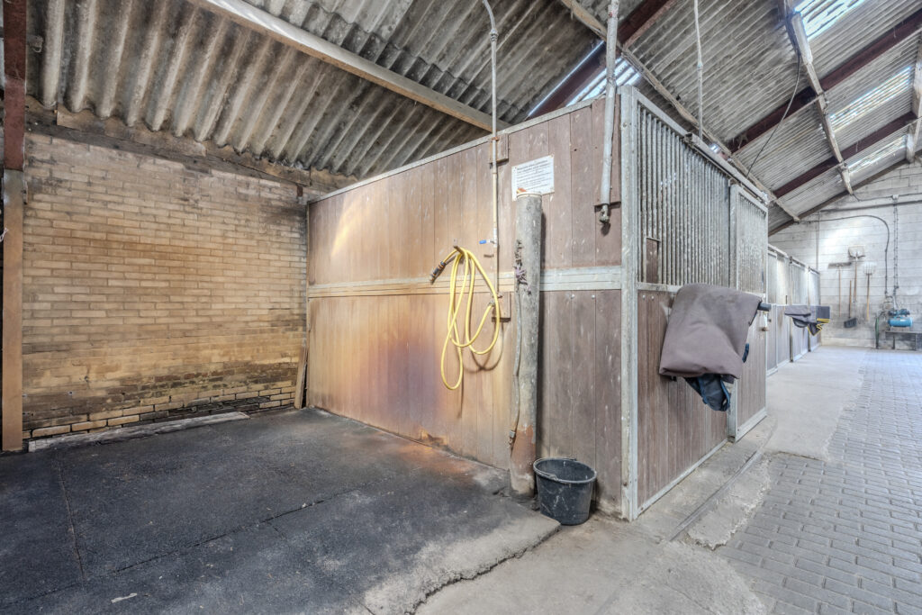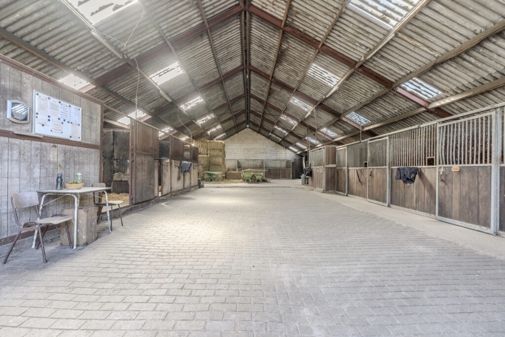 De schuur van circa 30 x 15 meter is aan de voorzijde toegankelijk via een schuifdeur en een loopdeur aan de zijkant. De indeling bestaat naast de twaalf ruime stallen uit een zadelkamer, was -/ poetsplaats en hooi -/ stro opslag. De watervoorziening in de schuur is voorzien van een rondpomp en verwarmingssysteem.