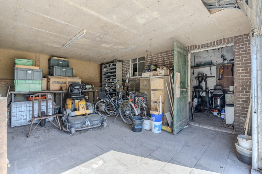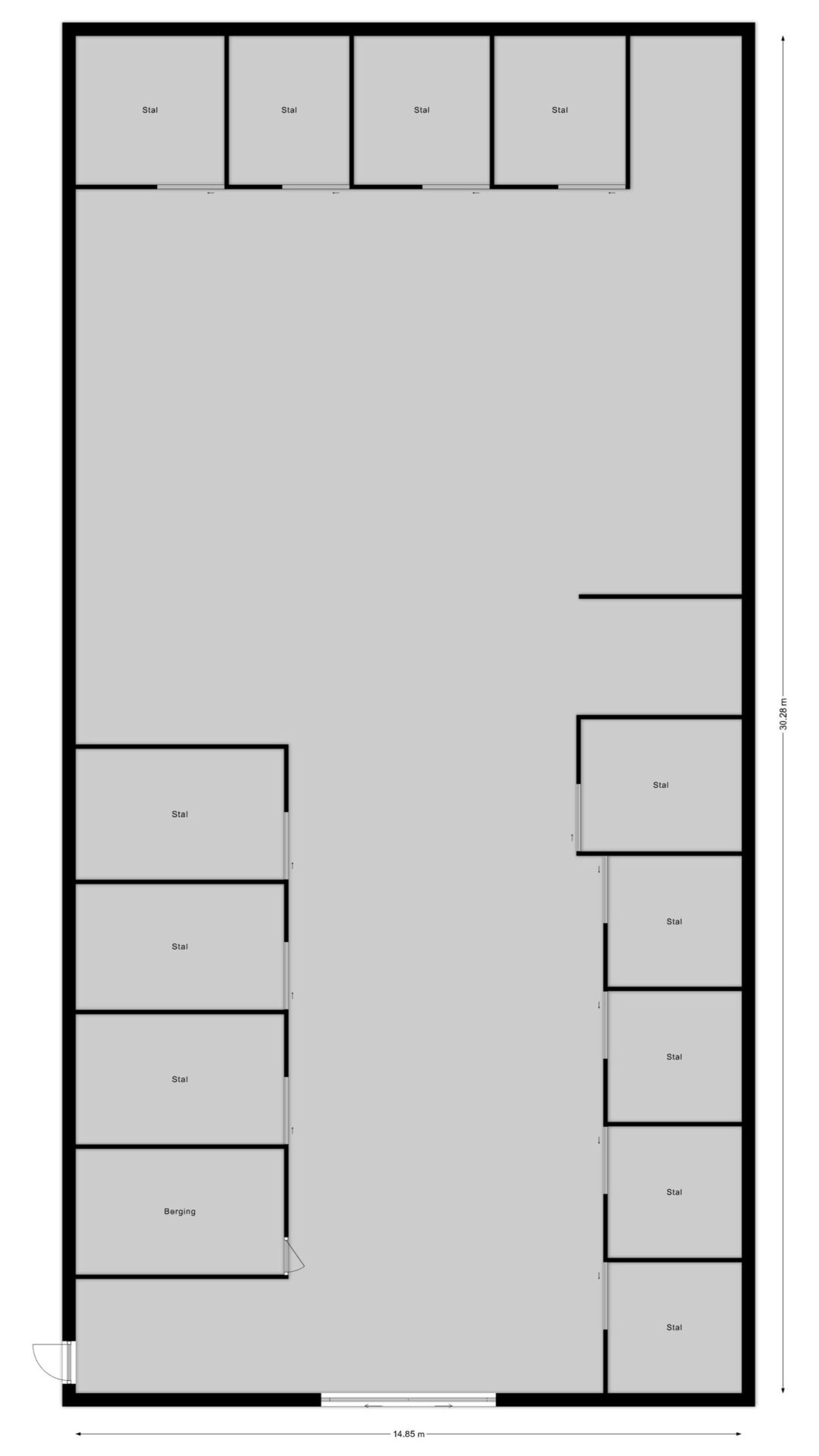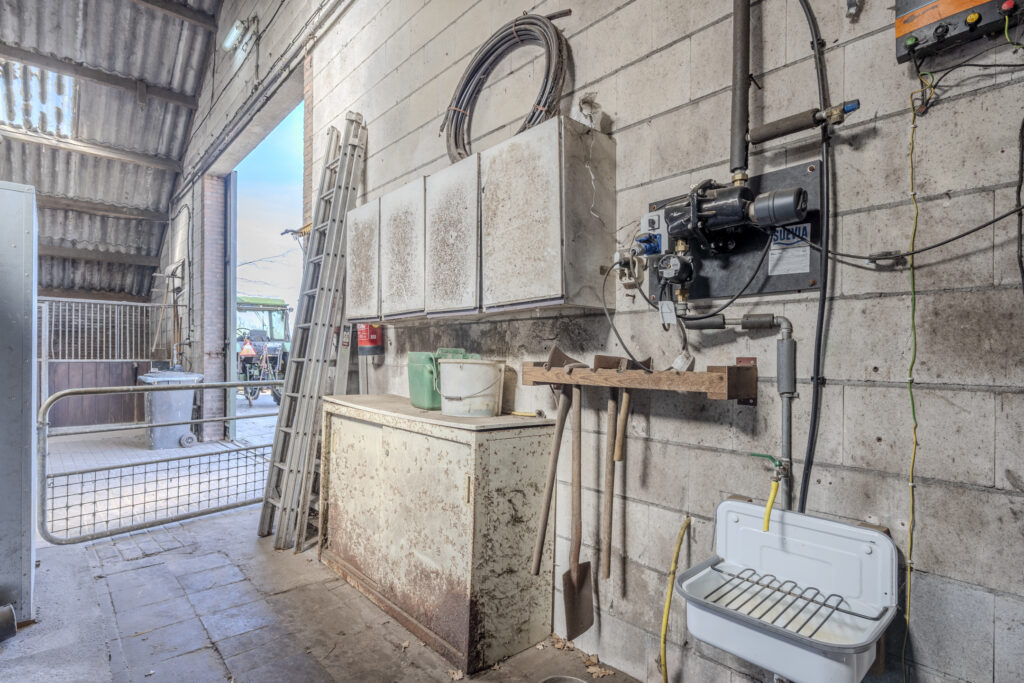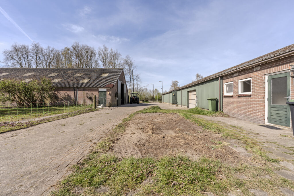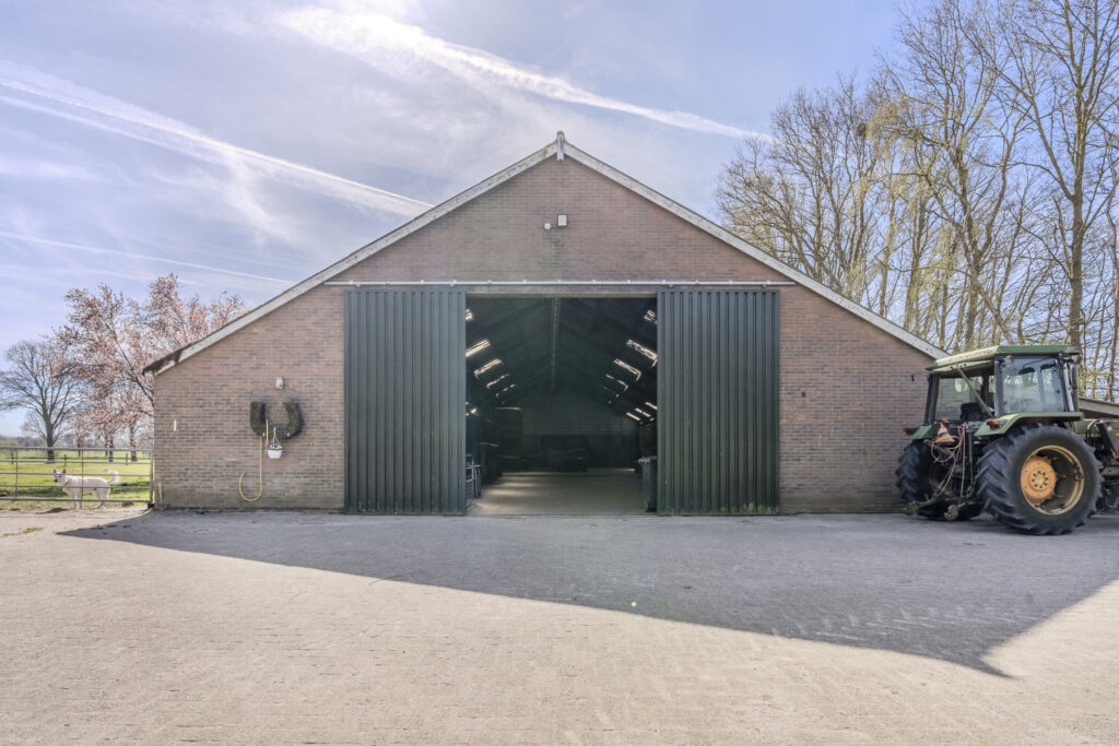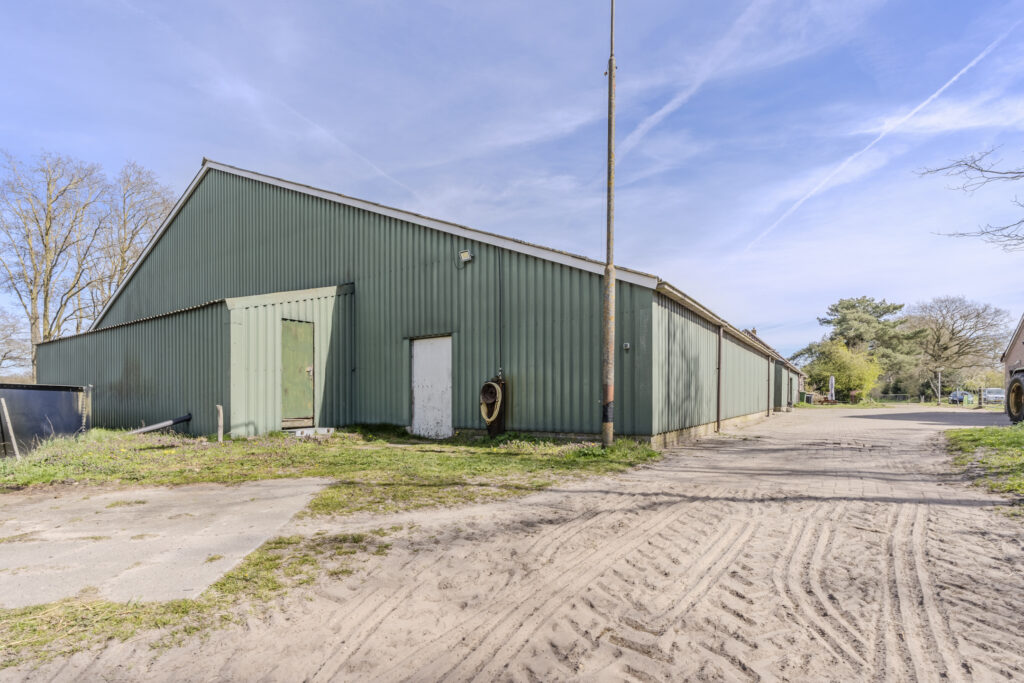 De schuur van circa 30 x 15 meter is aan de voorzijde toegankelijk via een schuifdeur en een loopdeur aan de zijkant. De indeling bestaat naast de twaalf ruime stallen uit een zadelkamer, was -/ poetsplaats en hooi -/ stro opslag. De watervoorziening in de schuur is voorzien van een rondpomp en verwarmingssysteem.
