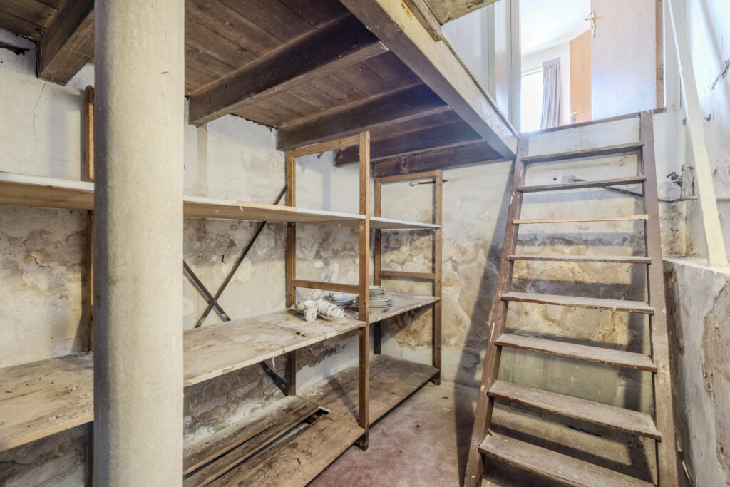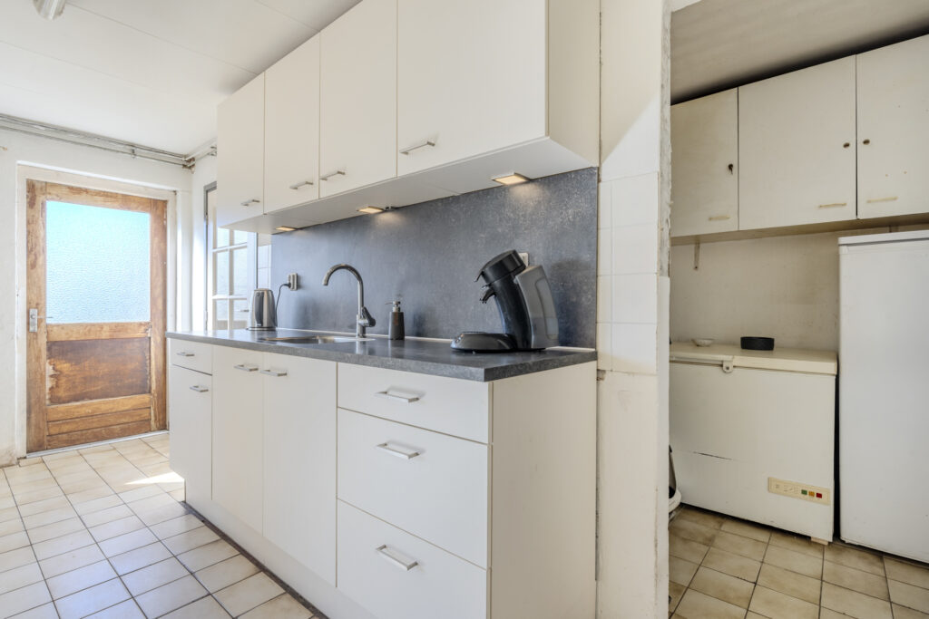 Entree via de hal waarin zich de toegang tot kantoor, badkamer, berging en de keuken bevindt. In de keuken bevindt zich de toegang tot de bijkeuken en de woonkamer die onder andere toegang geeft tot de gang met aanliggend een slaapkamer, toilet en trap naar boven. Tevens geeft de woonkamer toegang tot de kelder.