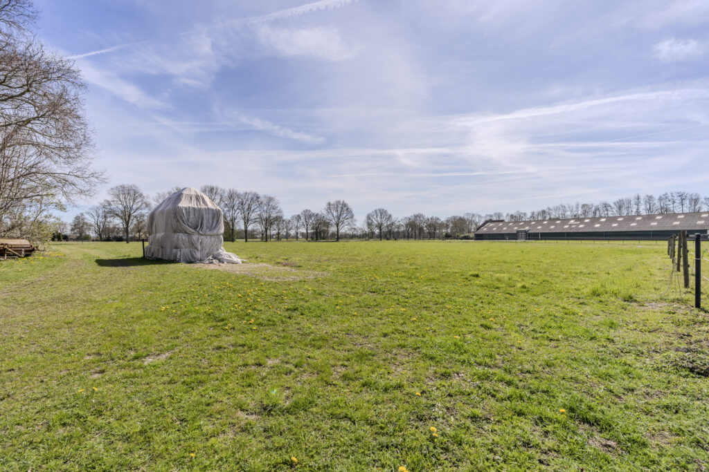 Deze locatie biedt alles om wonen en het houden van paarden te combineren. Op het royale perceel van maar liefst 36.085 m² staat een woonboerderij met aangebouwde rijhal, garage, werkplaats, opslag voor hindernismateriaal en vier stallen. Daarnaast is er een vrijstaande schuur aanwezig met twaalf stallen, een zadelkamer, hooi -/stro opslag en een was-/poetsplaats.