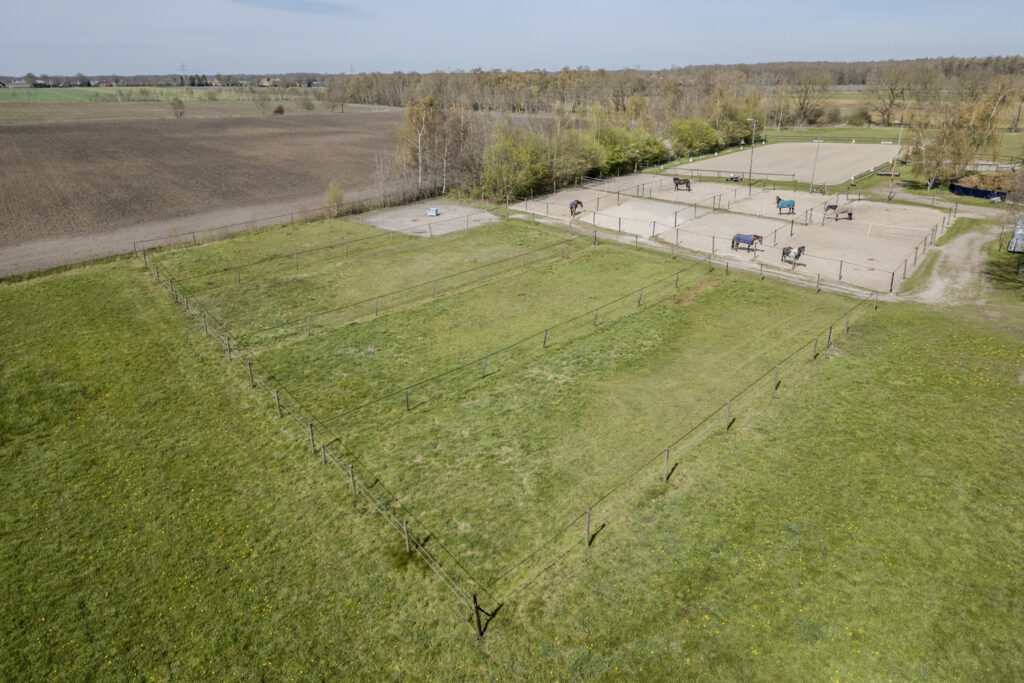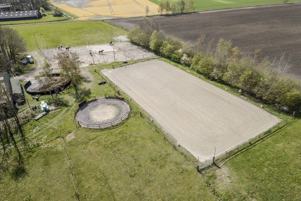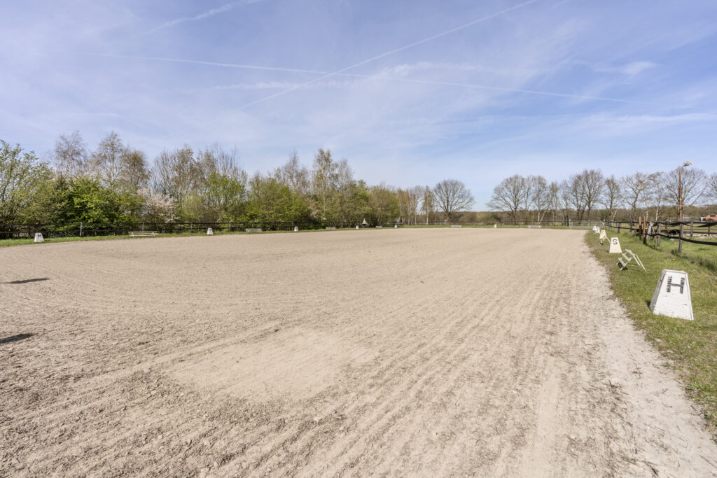 Een rijbaan van ongeveer 25 x 60 meter met goede bodem. Daarnaast zijn er meerdere paddocks, een longeercirkel en een mestopslag aanwezig, waardoor de faciliteiten goed zijn ingericht voor de training en verzorging van paarden. De weiland liggen rondom de gebouwen.